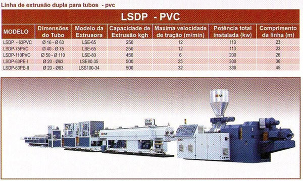 Linha de extrusão LSDP PVC/PE com sistema de extrusão para tubos duplos com dimensões de 16 a 110mm. A linha completa possui Extrusora, Unidade de Calibração à vácuo Puxador, Unidade de Corte e Sistema de Empilhamento de Tubos.